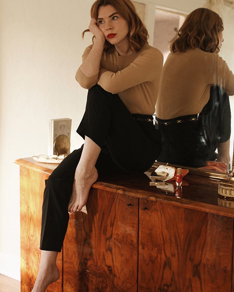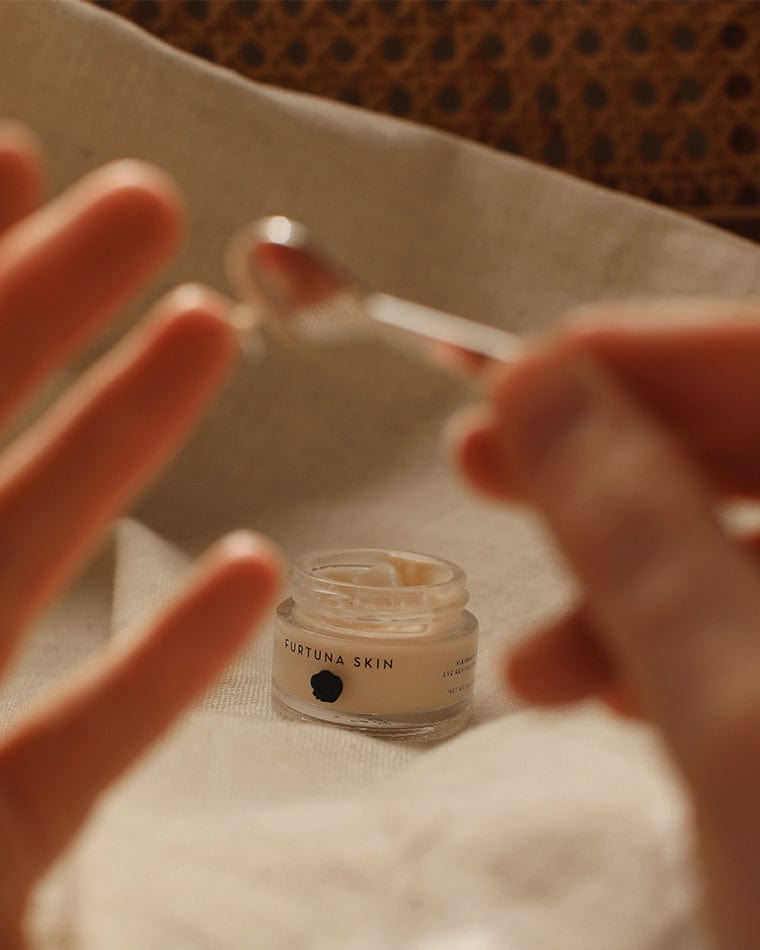 I have pretty sensitive skin, so I keep my products minimal. In the morning I start by pressing face oil into my skin; I like Mara Universal Oil or their Vitamin C Oil. I use a gua sha tool to help reduce any puffiness and to sort of sculpt my face a bit. I pat Furtuna Skin Eye Cream in and finish with Saie Sunscreen. I’ll maybe do a mask if I have a shoot coming up, but I usually just let my skin be on most days.