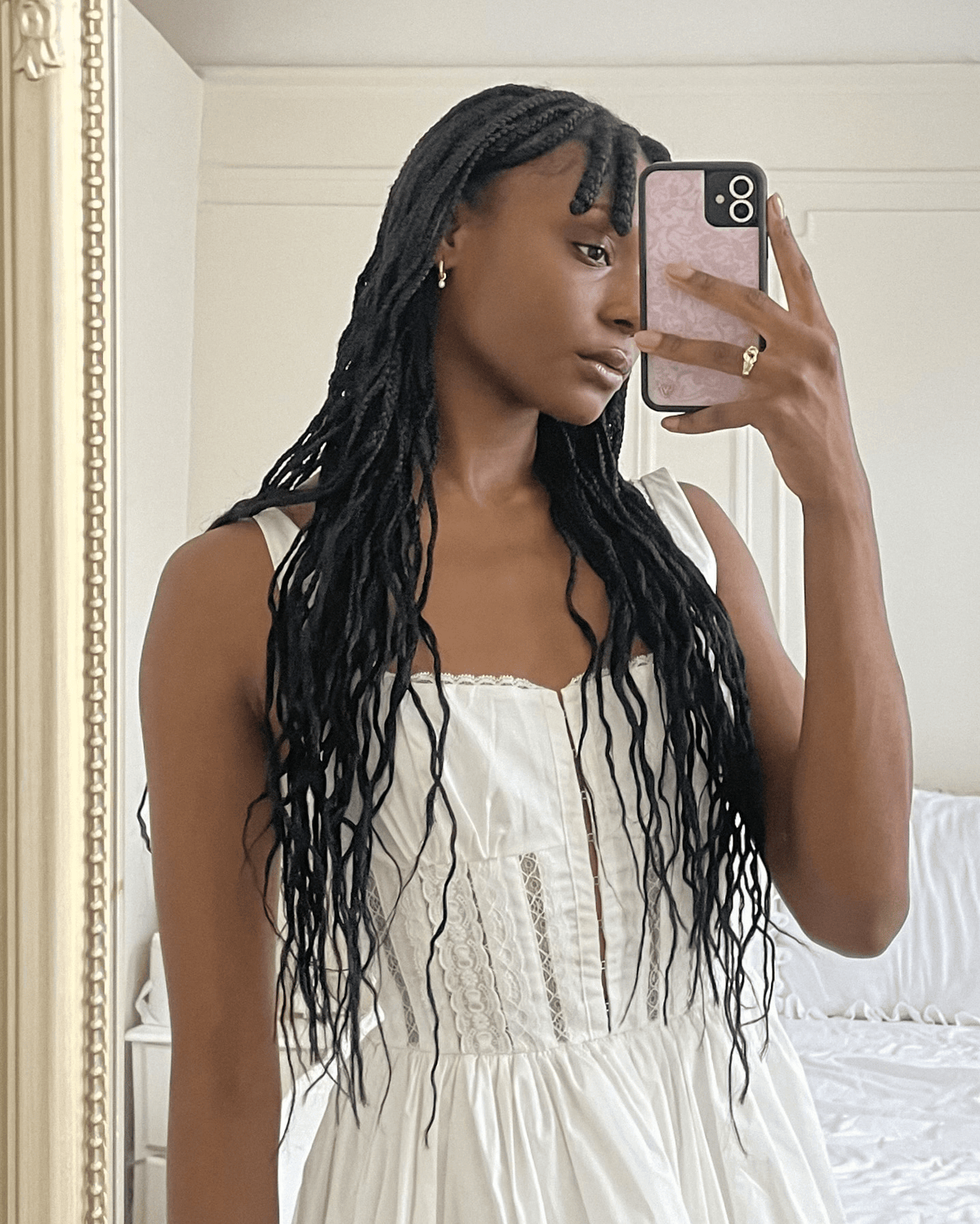 I love getting knotless braids. I go to a braid shop in Harlem. It’s just a great protective style and not too hard to maintain. I usually just oil my scalp and do my edges. I use Edge Booster Strong Hold for edge control. I love it because it doesn’t flake.