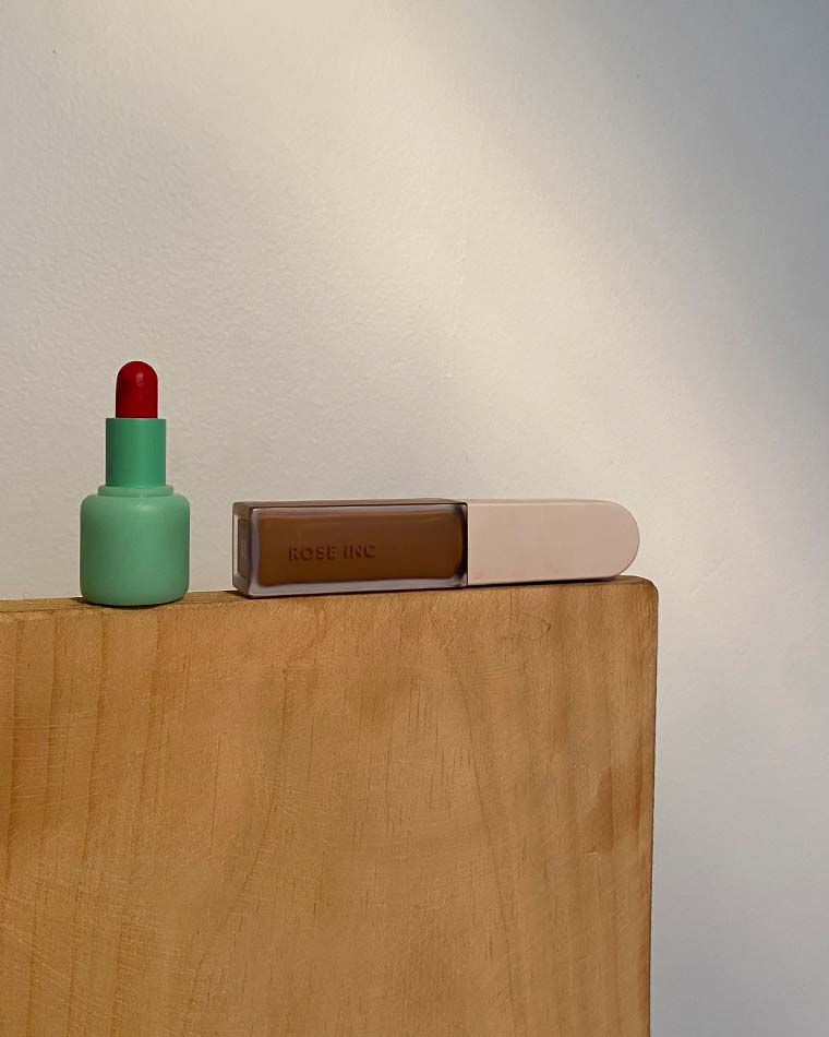 The Rose Inc concealer is amazing — and I’m not even a crazy makeup person. I’m more of a blush, mascara and lip girl. I definitely have to say the Softlight Concealer is on point. I also like Glossier’s Future Dew. It’s simple and gives you a nice dewiness. When I don’t wear red lipstick I’m loving Marc Jacobs blue eyeliner with mascara and keeping my skin natural, then topping it off with a lip gloss.