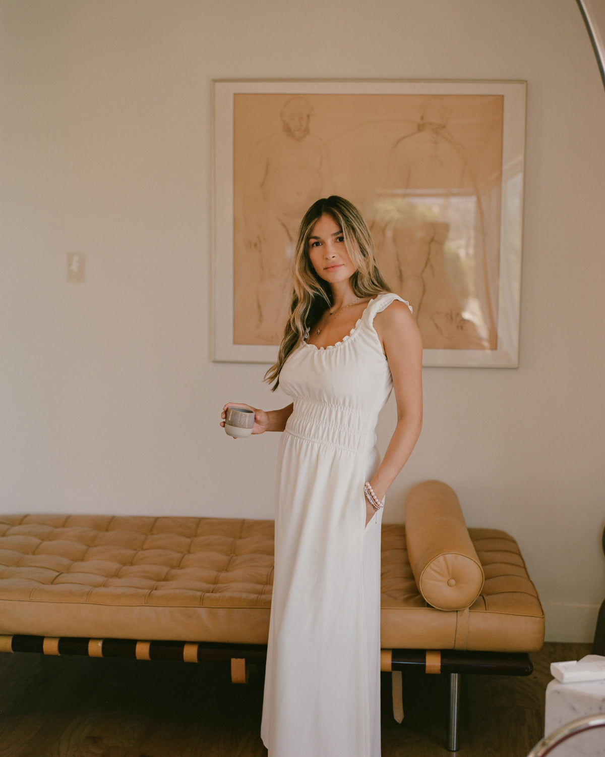 Bala co-founder Natalie Holloway believes fitness should be fun and approachable. Wearing the brand’s signature ankle and wrist weights for yoga or walking her dog are just some of the ways Holloway gets her workouts in during the day, and a go-to playlist helps sustain the good vibes along the way.
