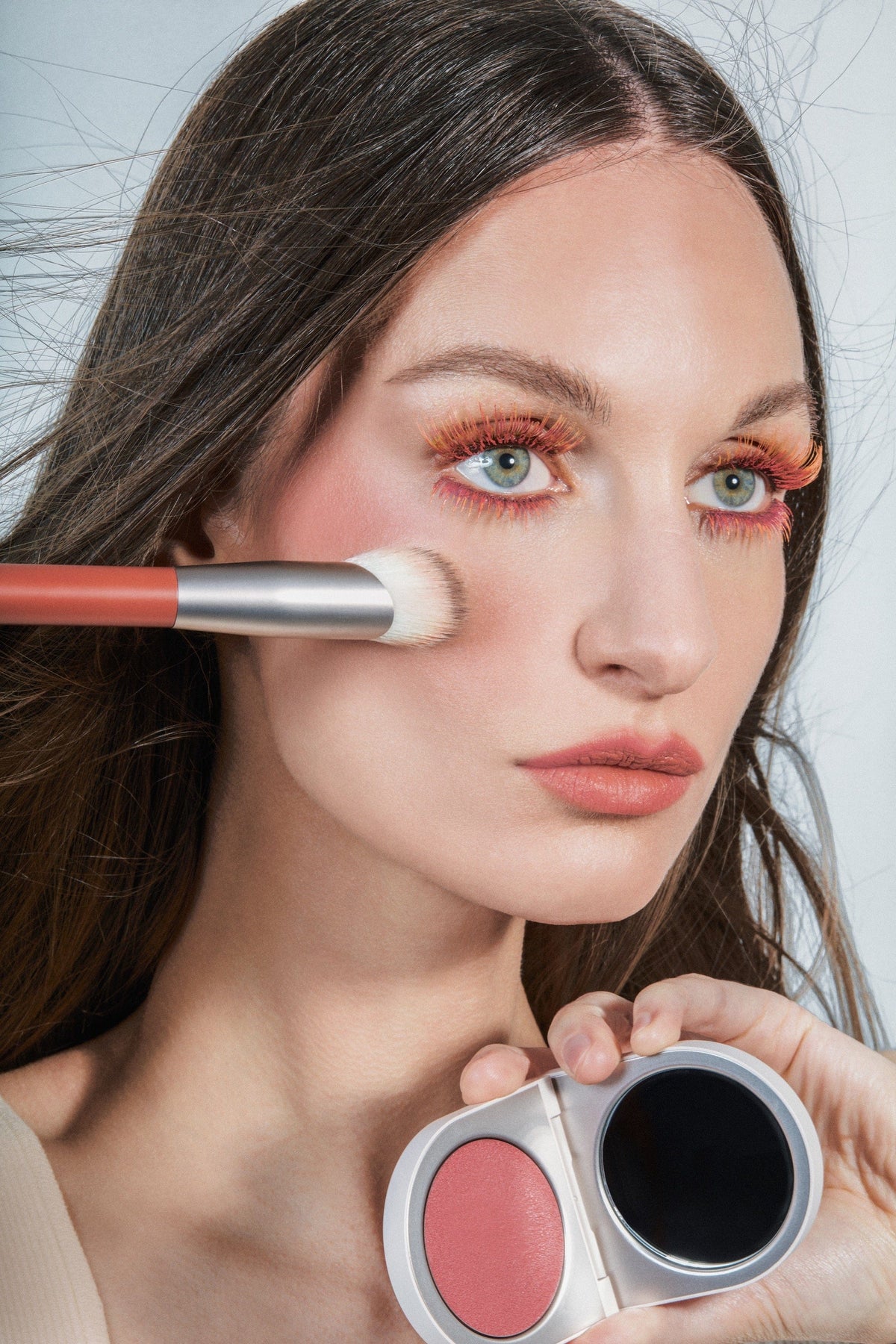 The lip colors were also strategic. “The contrast between the cool, blush-toned Demure and the muted coral Poetic shades did this trick,” she explains. “Not only because the shades are different in color, but one is cooler and the other one is warmer which adds an extra contrast.”