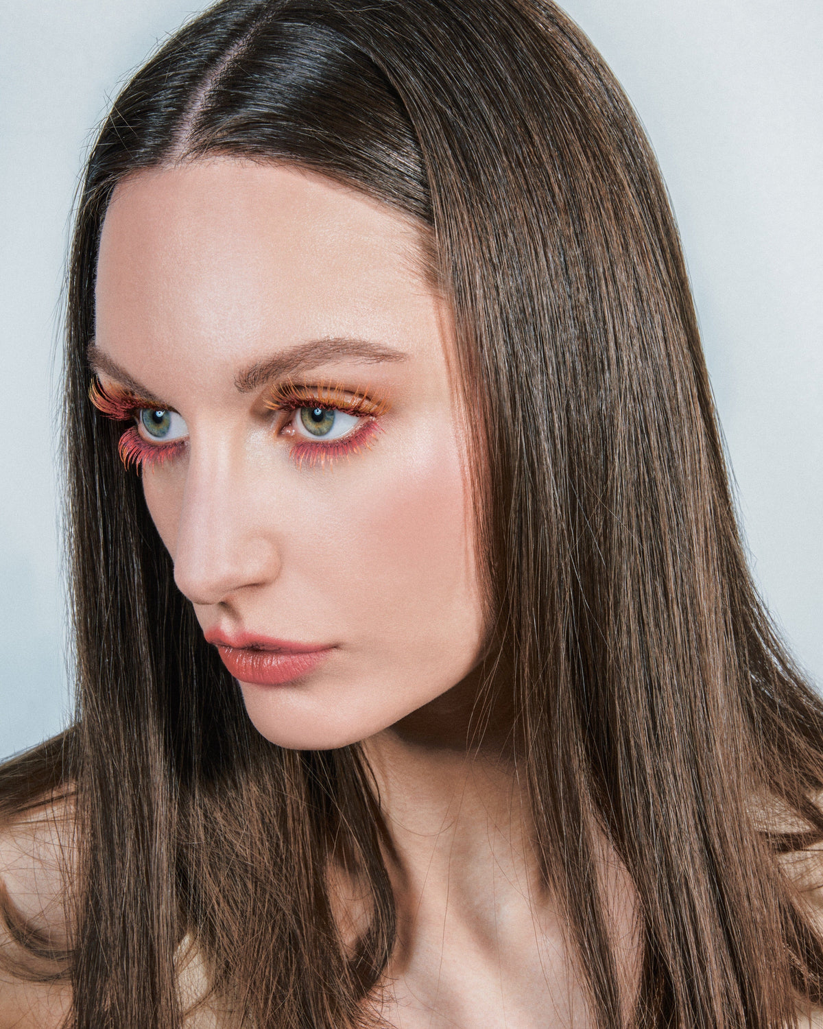 Lashes came next. “I used the DUO Brush-On Striplash Adhesive and applied the lashes as close as possible to the natural lash line,” she says about the custom set. “Once the lashes are on, it is easier to decide on which shades will fit best to complement the eyes, and nicely balance out the entire look.”
