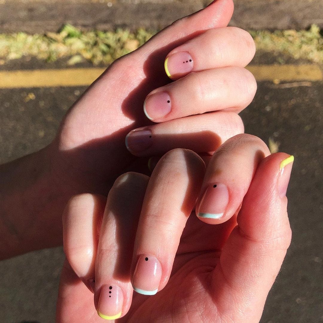 Technicolor hues dotted atop a sheer nail is also a popular request, Diogo says. To try the look yourself, use any pointy object, such as the tip of a toothpick, to dot the polish on the nails.